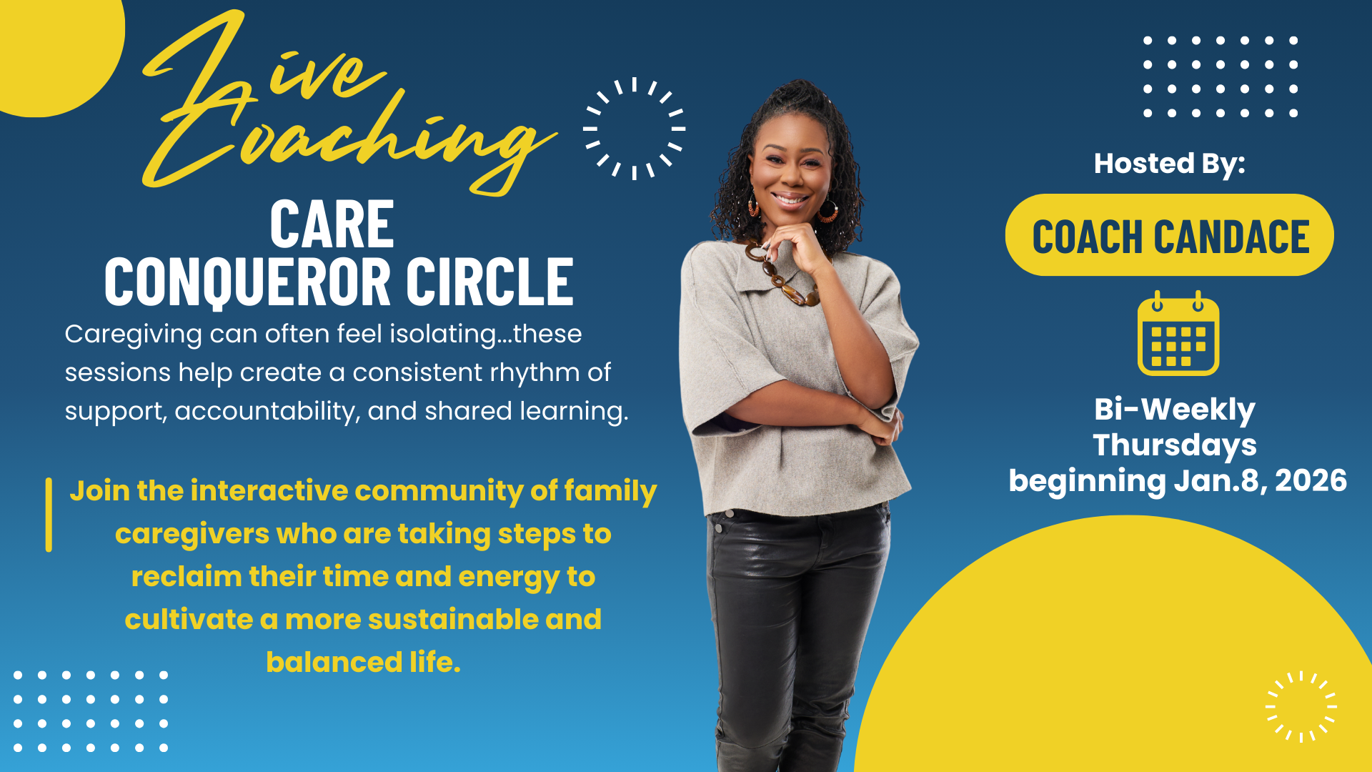 Join us for bi-weekly live coaching sessions designed just for family caregivers and those who support them. Get guidance, practical tools, and real-time support to navigate the everyday challenges of caregiving — without the overwhelm.